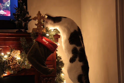 I took about 10 seconds after I'd finished the fireplace for Percy to investigate. I think he can read, he went right to the stocking with his name on it. I should have known shimmery things would attract a curious cat.